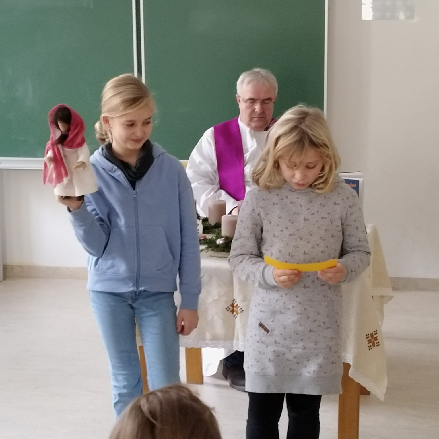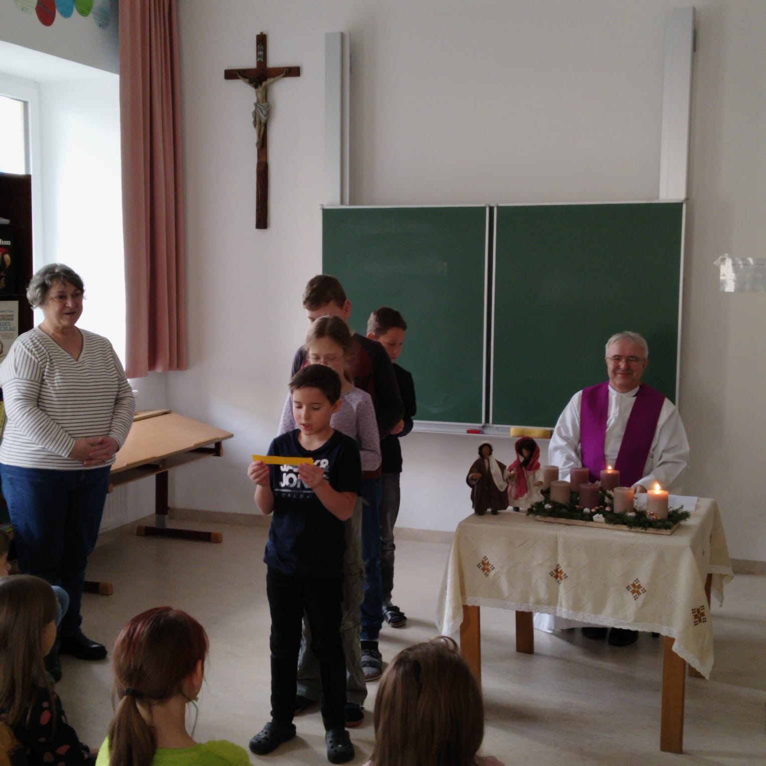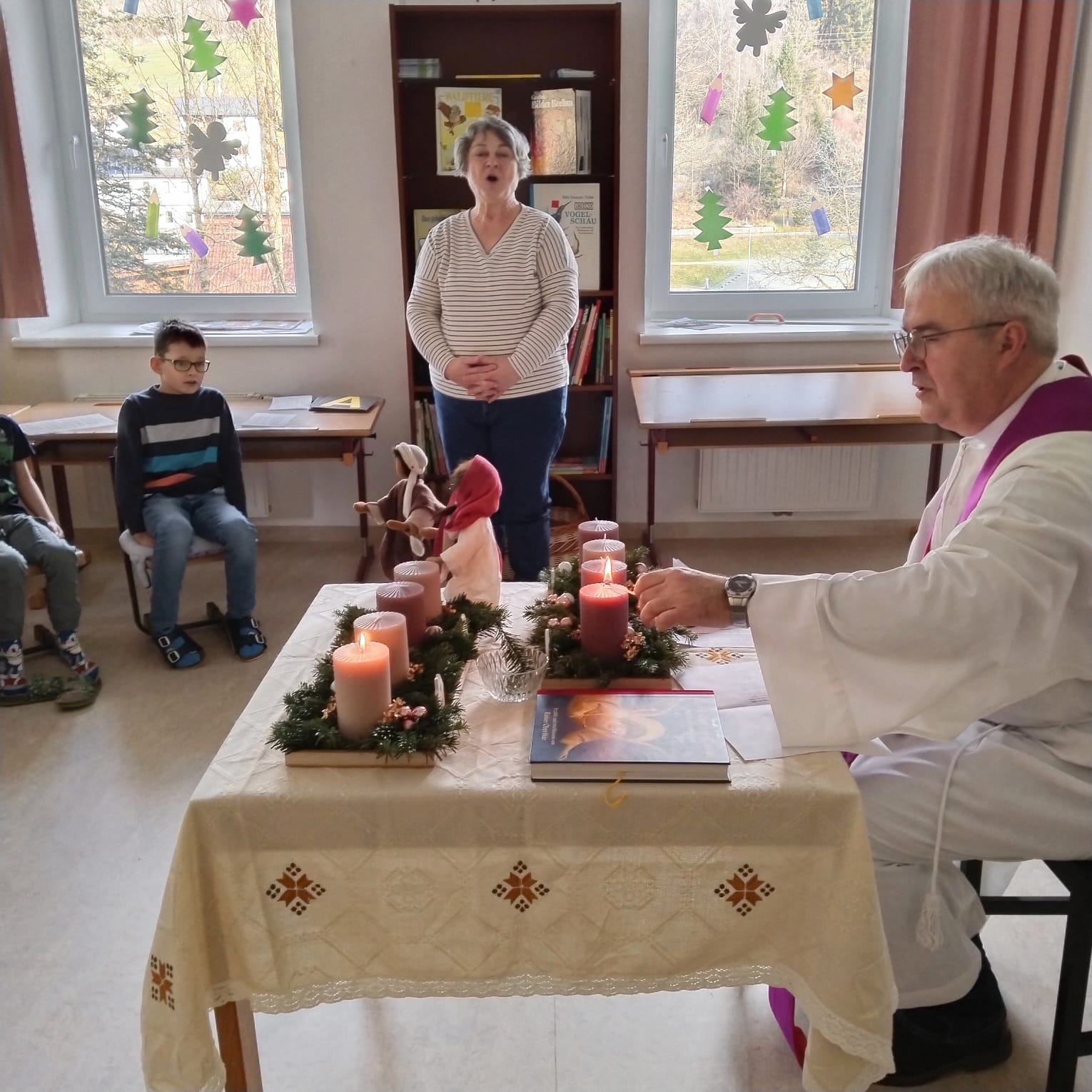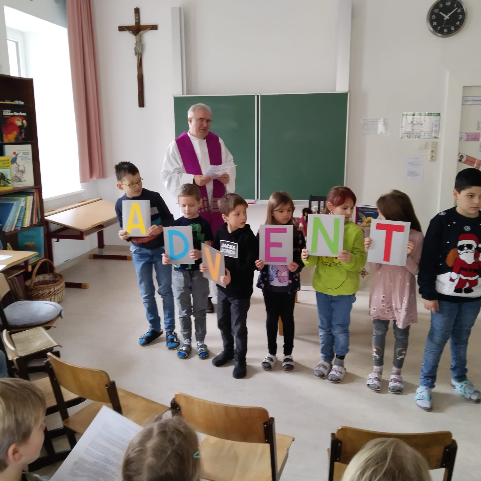 Heute fand in unserer Schule die feierliche Adventkranzsegnung statt. Passend zur Einstimmung auf die Adventzeit wurde der Text „Jesu Geburt wird angekündigt“ vorgelesen. Dieser Text erinnert uns an die Bedeutung des Advents, der „Ankunft“ Christi.