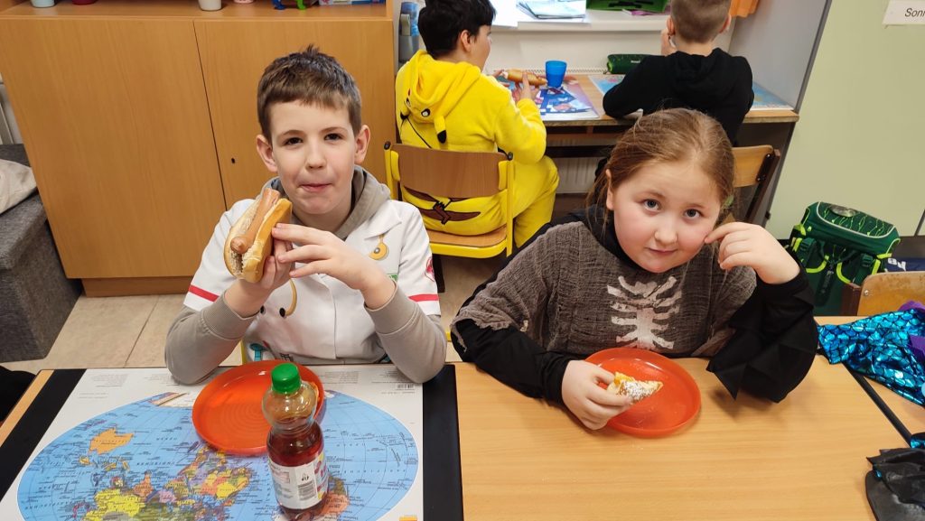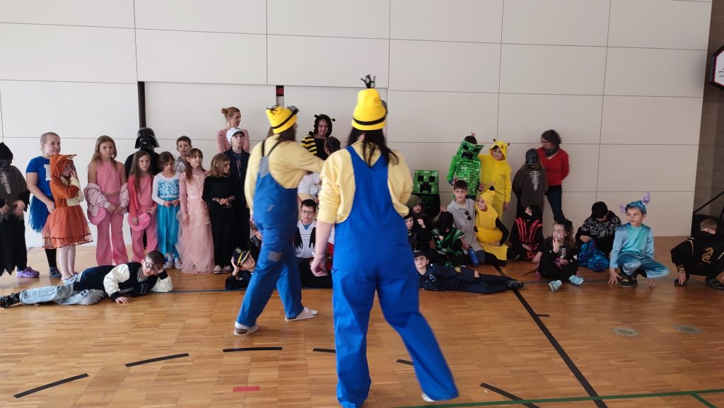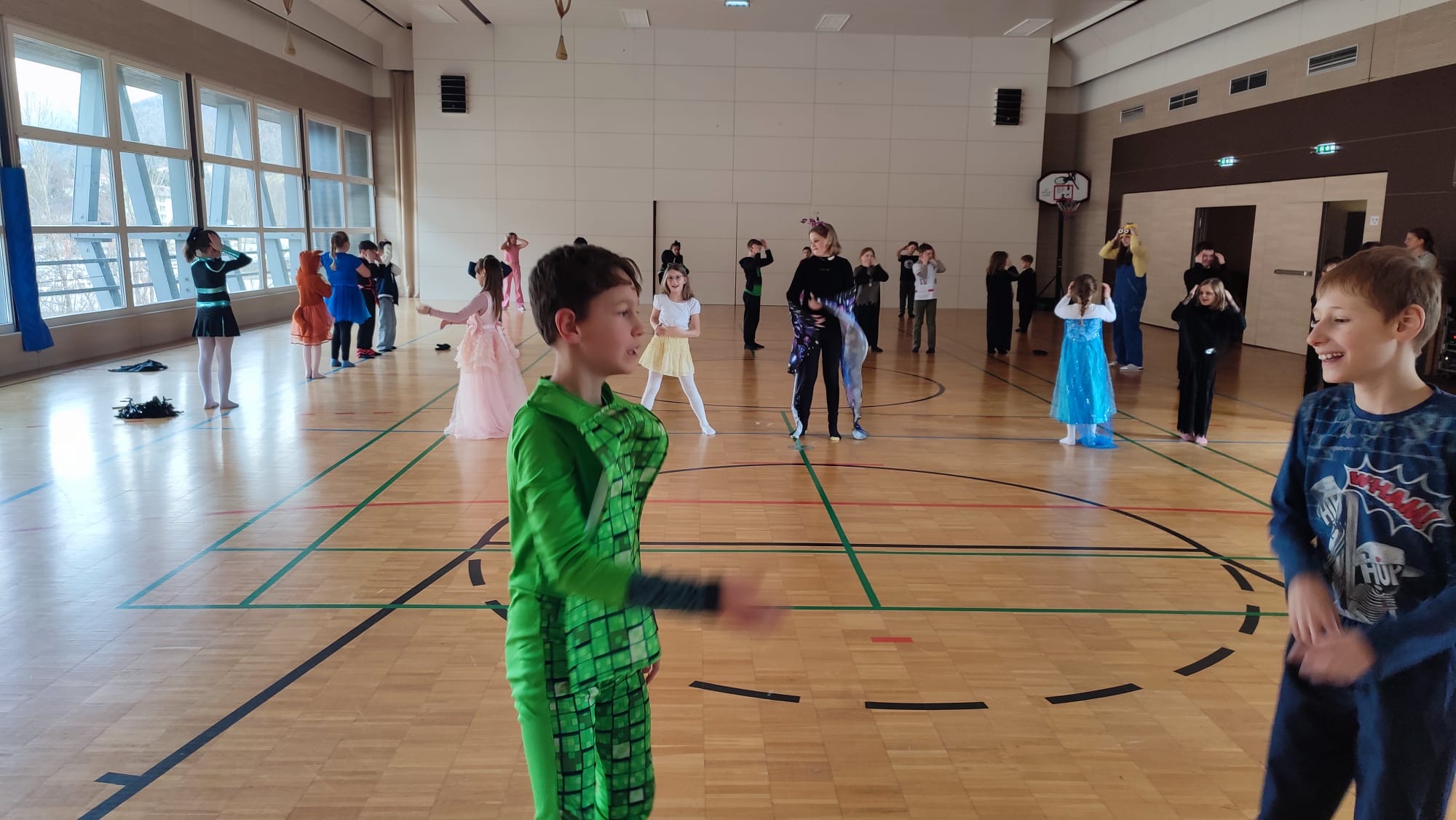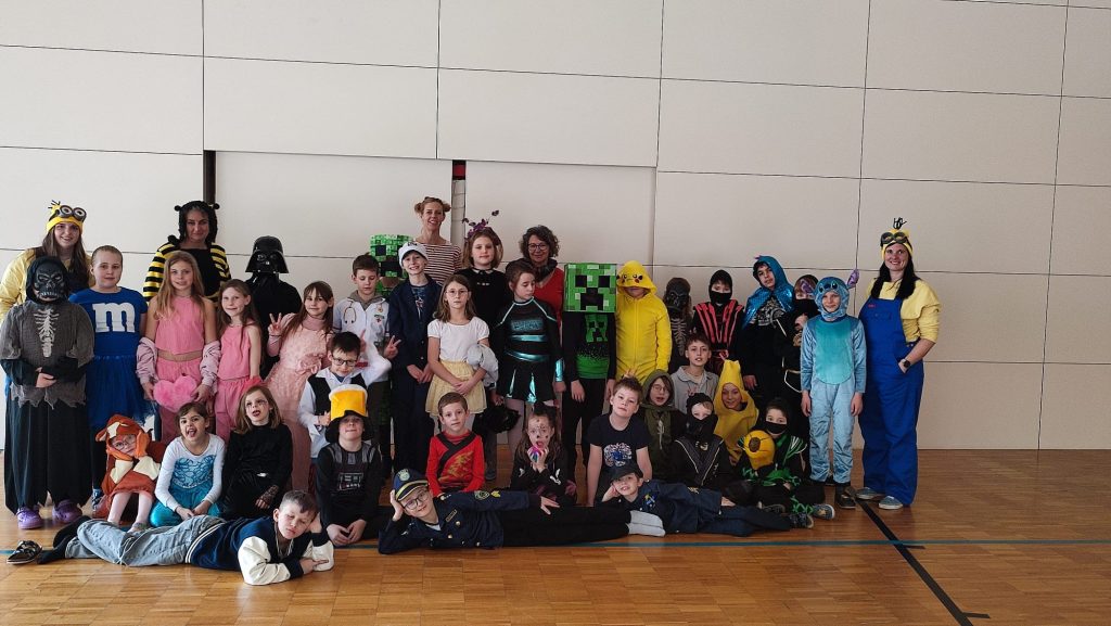 Die Schülerinnen und Schüler erschienen in fantasievollen und bunten Kostümen und sorgten für eine ausgelassene Stimmung im gesamten Schulhaus. Ein besonderes Highlight war das liebevoll vorbereitete Schulbuffet mit köstlichen Krapfen und Würsteln.