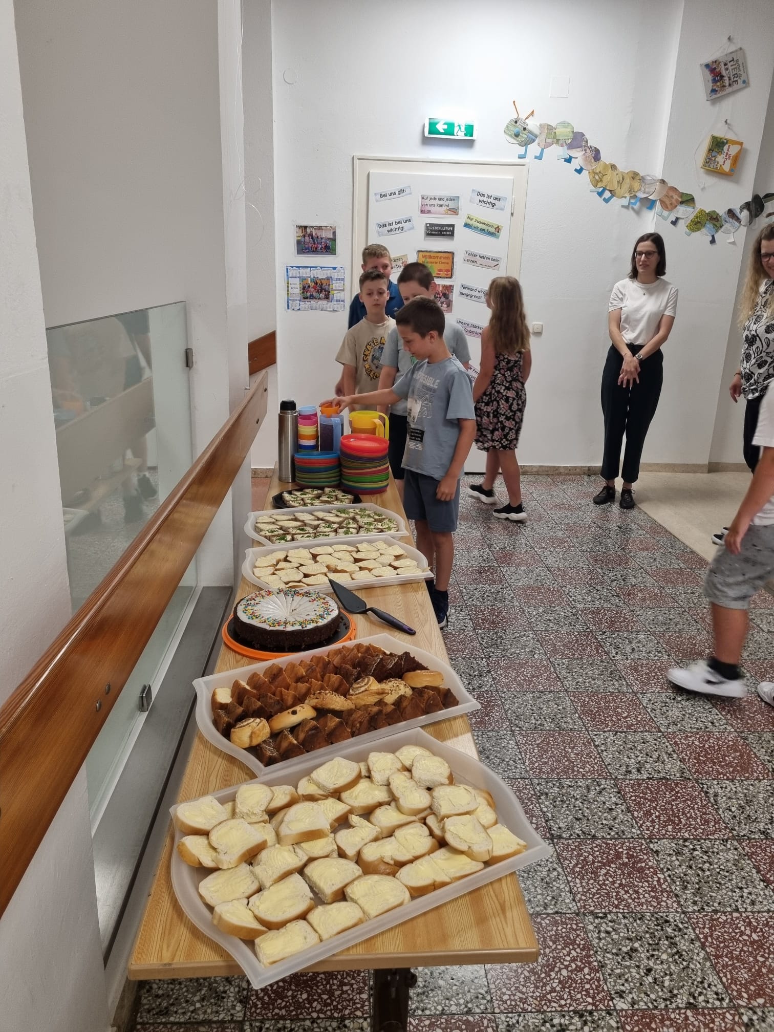 Bereits um 8 Uhr wurden die Kinder mit einem wunderbaren Frühstück überrascht, das unsere Eltern mit viel Liebe vorbereitet hatten – herzlichen Dank dafür! Gestärkt und voller Vorfreude ging es anschließend für die 1., 2. und 3. Schulstufe zur Zeugnisverteilung.