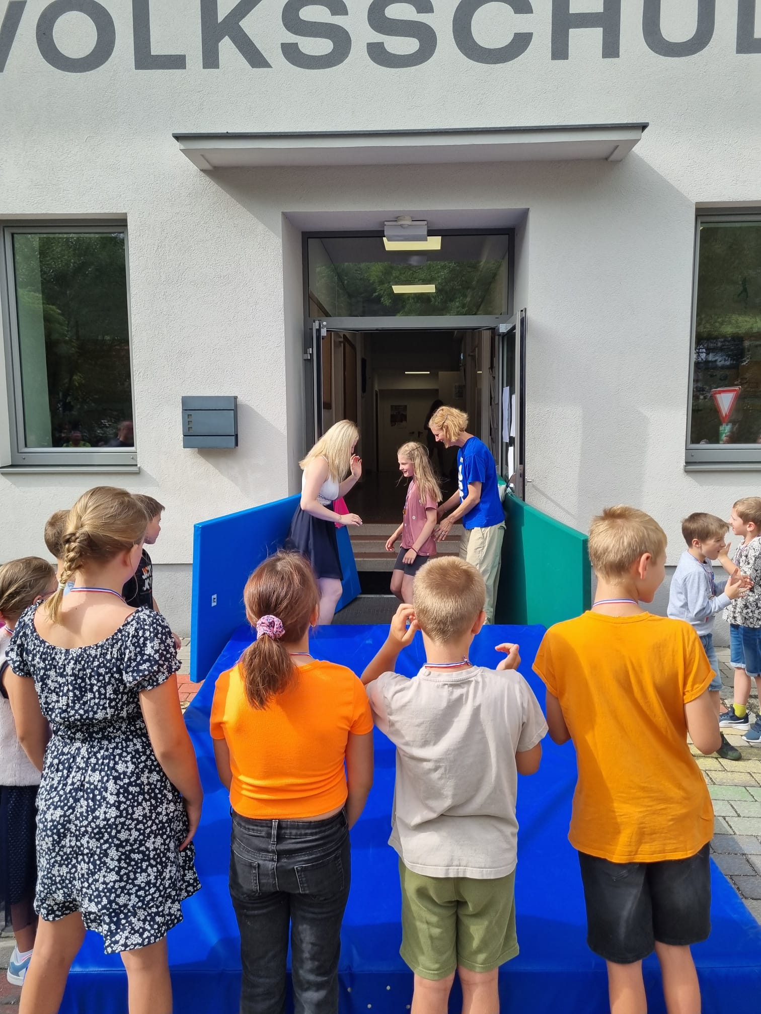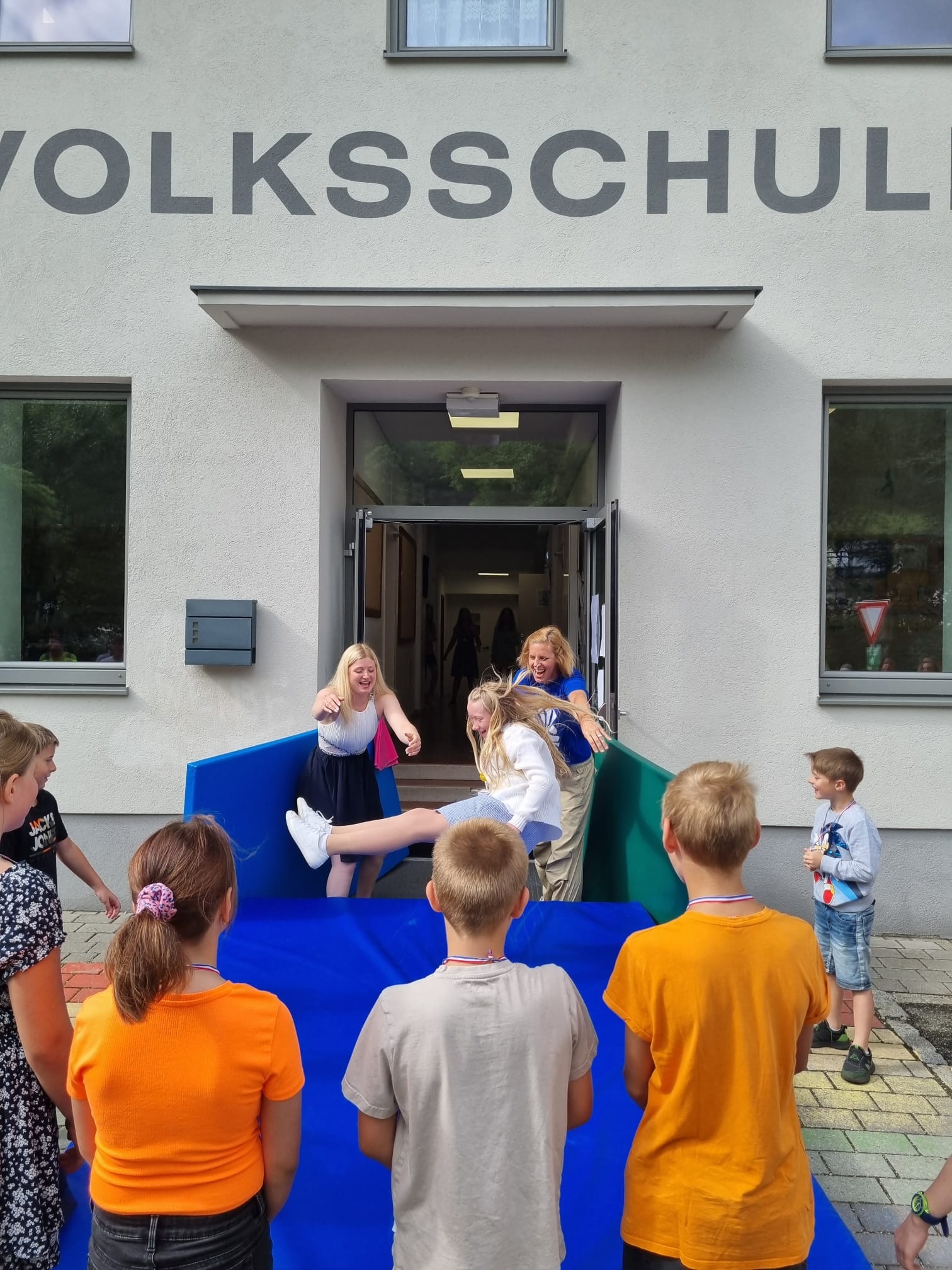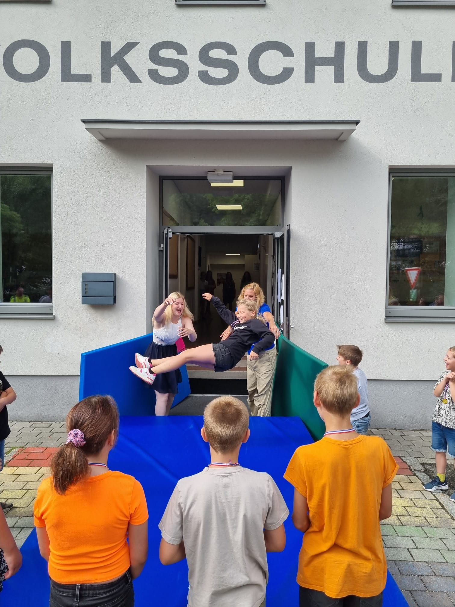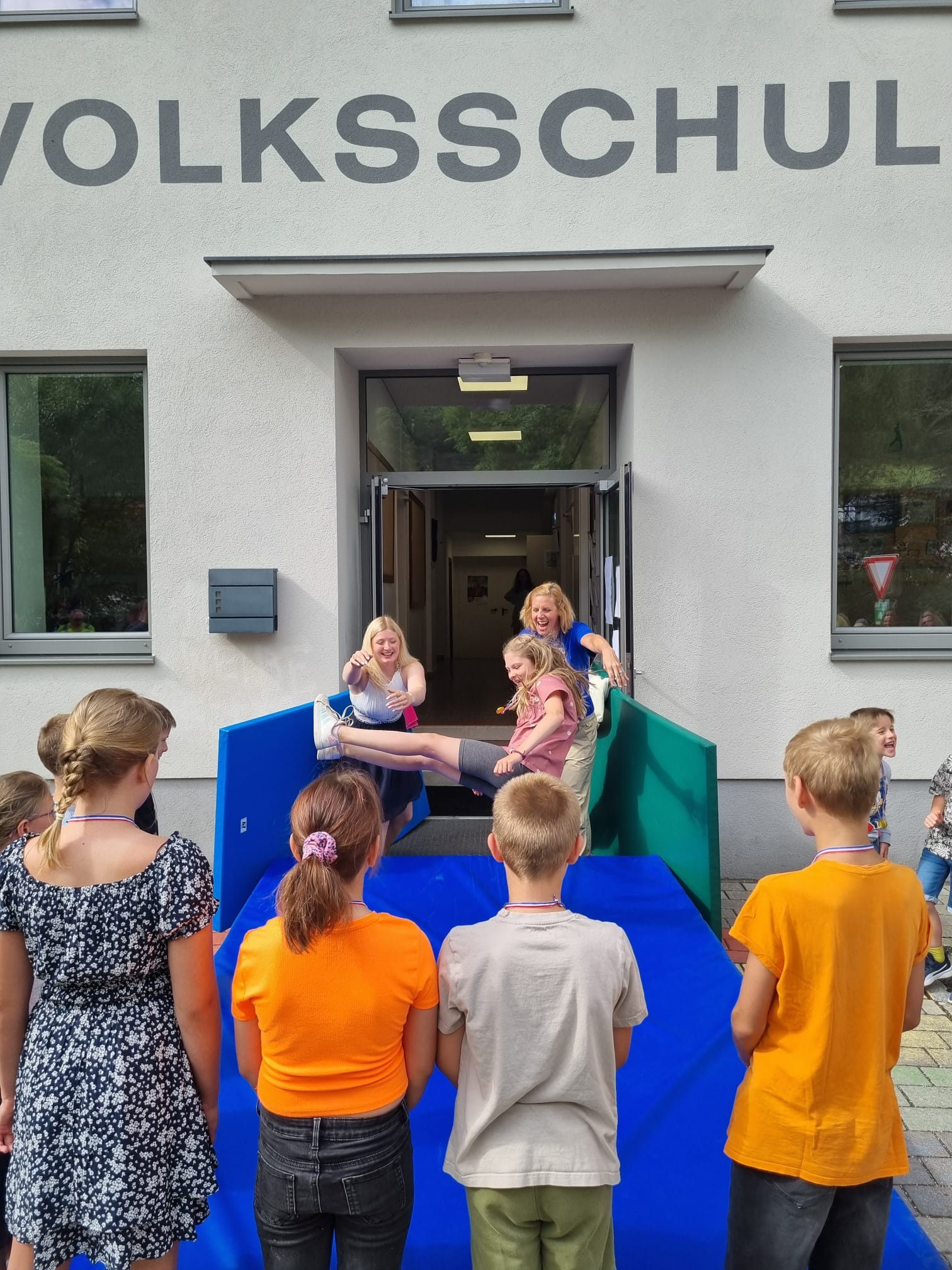Die 4. Stufe wurde, wie es bei uns Tradition ist, feierlich aus der Schule „geworfen“. Mit viel Applaus erhielten die Schülerinnen und Schüler ihr Abschlusszeugnis sowie ein kleines Geschenk als Erinnerung an ihre Volksschulzeit.