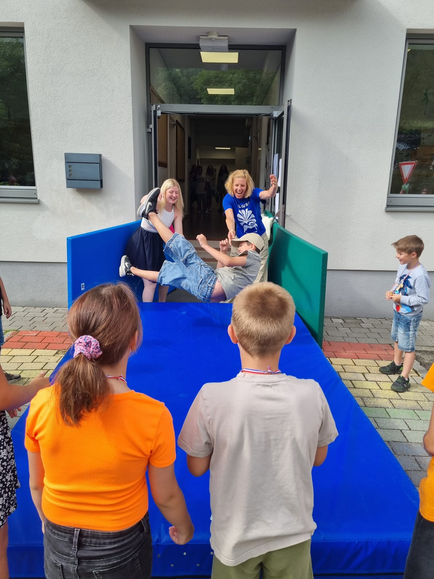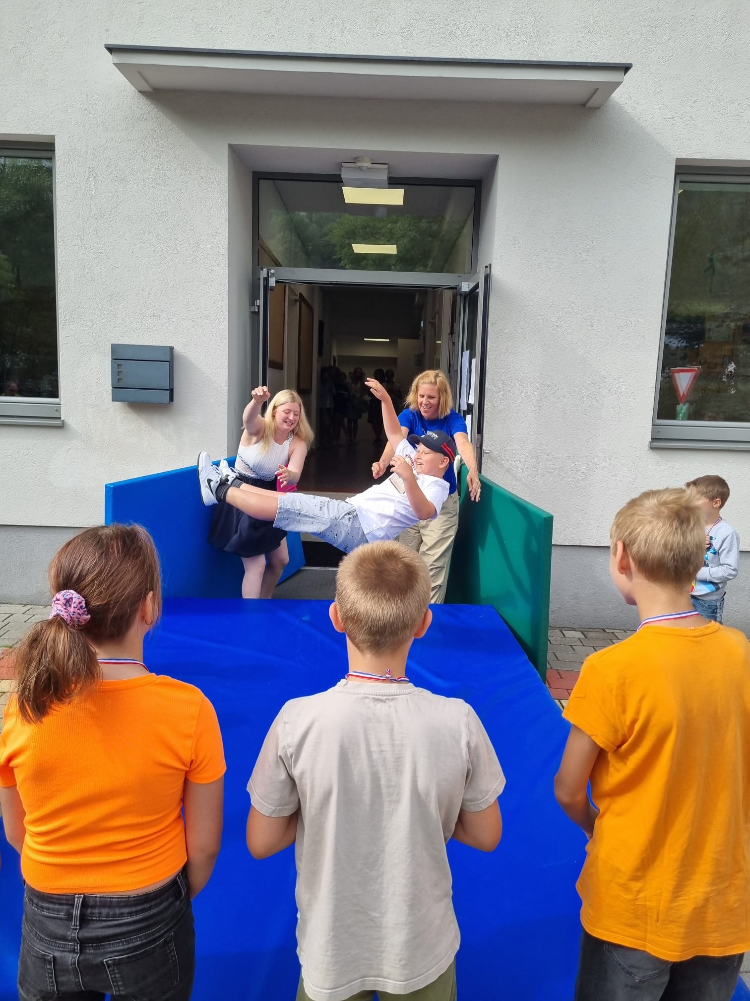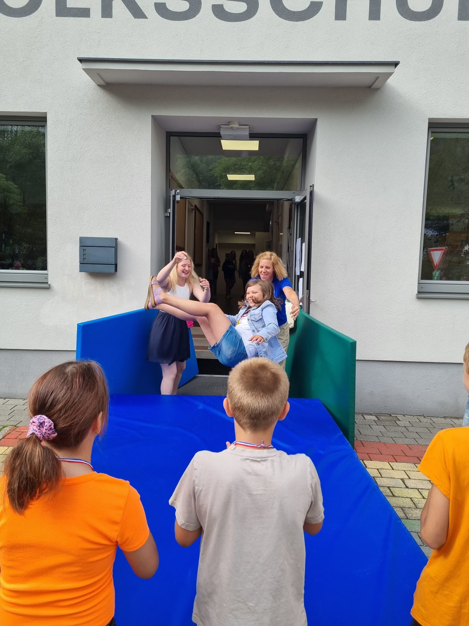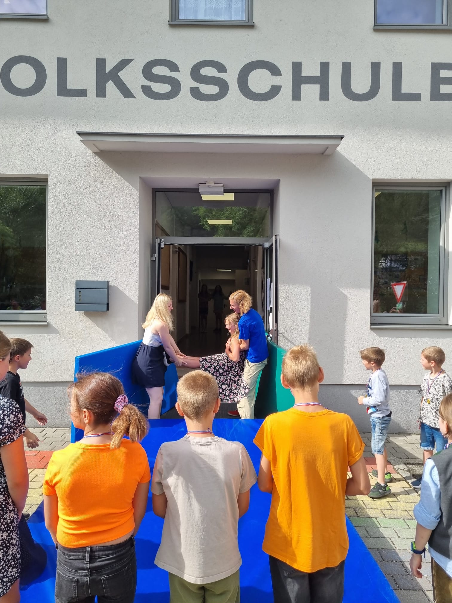 Die 4. Stufe wurde, wie es bei uns Tradition ist, feierlich aus der Schule „geworfen“. Mit viel Applaus erhielten die Schülerinnen und Schüler ihr Abschlusszeugnis sowie ein kleines Geschenk als Erinnerung an ihre Volksschulzeit.